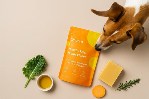 Onbord leads the way in ethical pet nutrition by creating plant-based, high-quality supplements that care for pets and the planet. Our vision is simple, transparent, and 100% sustainable pet health. We focus on forming positive habits for your dog’s health while working to protect the environment, share knowledge, and embrace ethical practices.